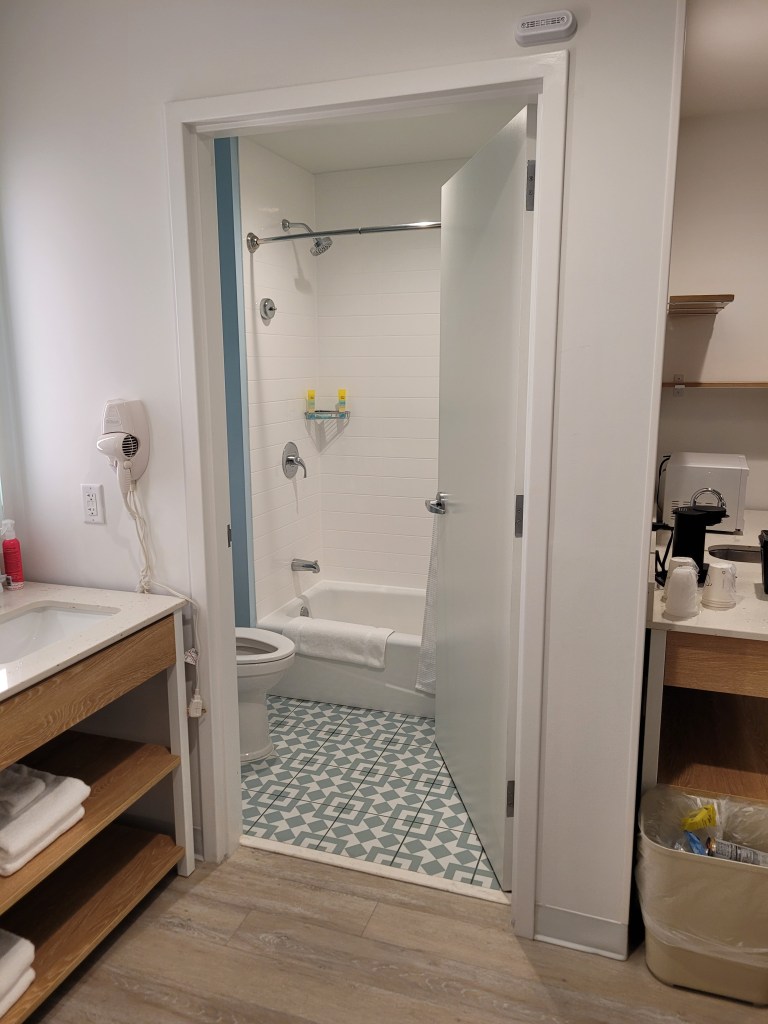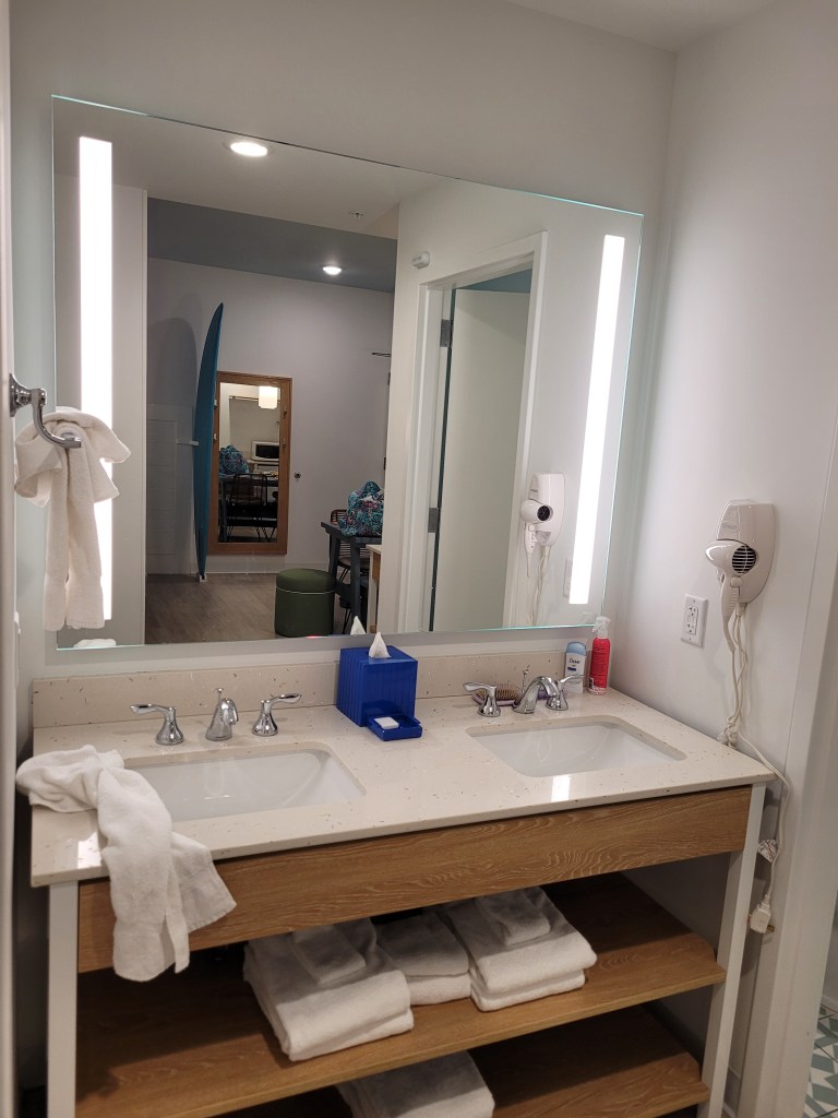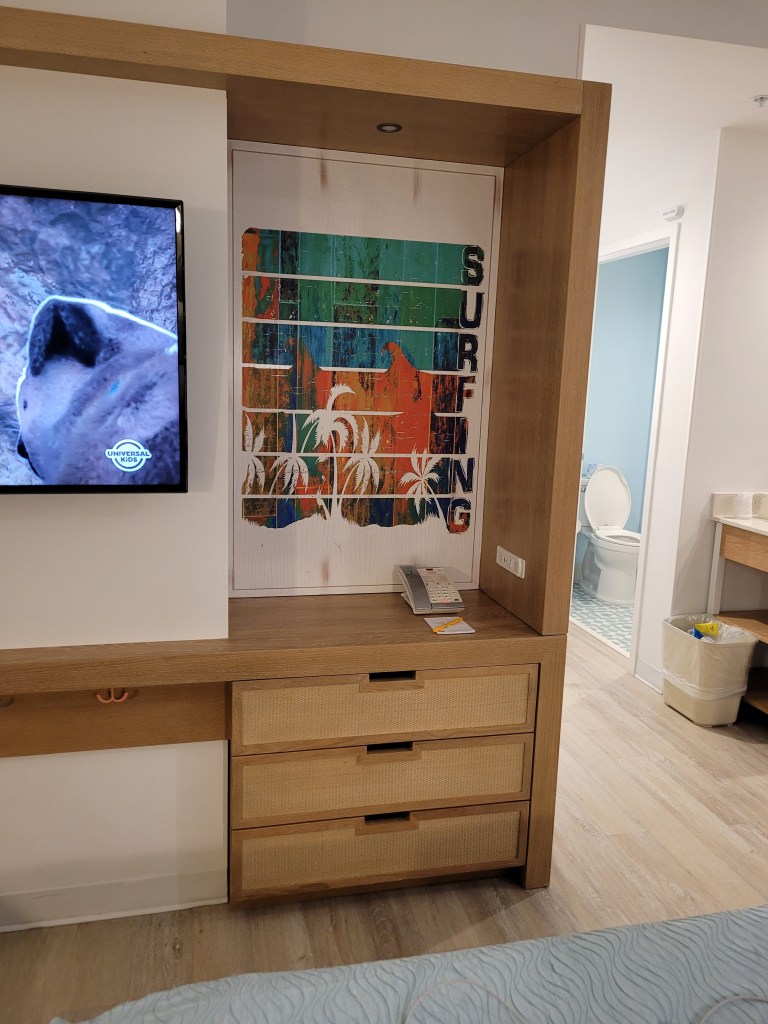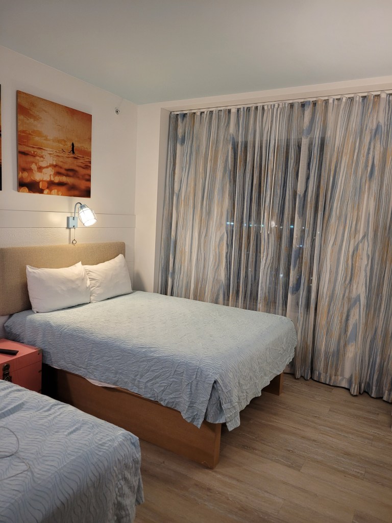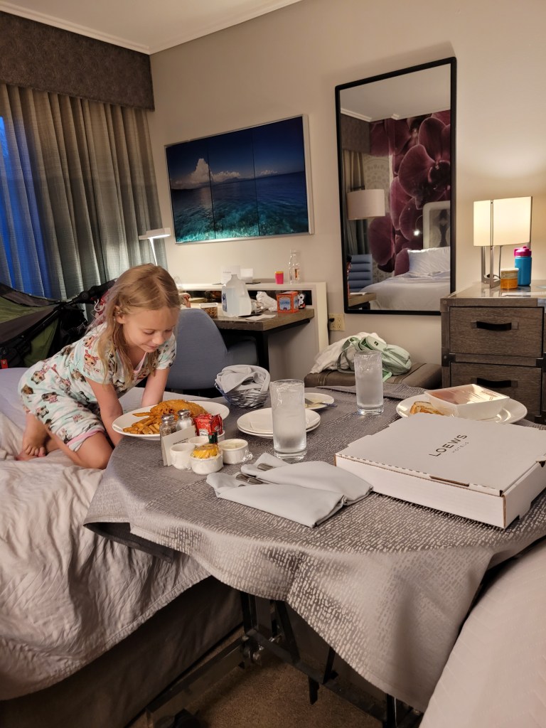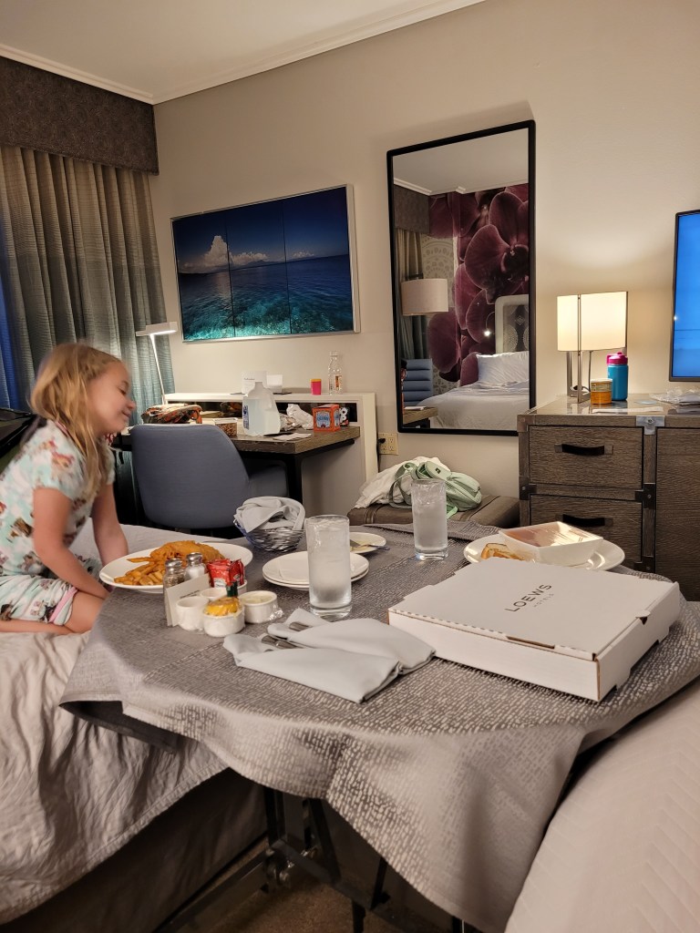 I initially thought we would leave early Friday morning for our weekend away, but the way life played out that week left both Maddie and I ready to pack and get in the car the second I was done with work Thursday night… and that is just what we did! We got a last minute reservation at Endless Summer Dockside. We have stayed at this resort before, but this was the first time Madie got to experience a 2 bedroom family suite (my second time- I stayed here one night on my own before Christmas). She absolutely LOVED the space and the features in the room. We ordered pizza from room service, and it was delivered within 20 minutes and it was tasty and affordable! Endless Summer is a really great option for anyone on a tight budget who wants to still experience Universal from the property. Like I mentioned before, I’ve stayed here twice before this and each time has been great.