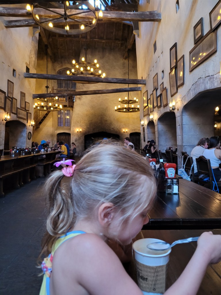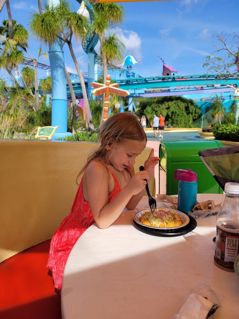 The walk from Royal Pacific was super short!!! (At least for me, I typically stay at Cabana Bay and sometimes Sapphire Falls). This was such a nice bonus for me since I’m a single mom and Islands is my/our favorite park at Universal 😃 Maddie was hungry when we got into the park and there was barely a line for one of our favorite spots to eat: Green Eggs and Ham! So of course we jumped in line and grabbed an order of green eggs and ham 🤤😋