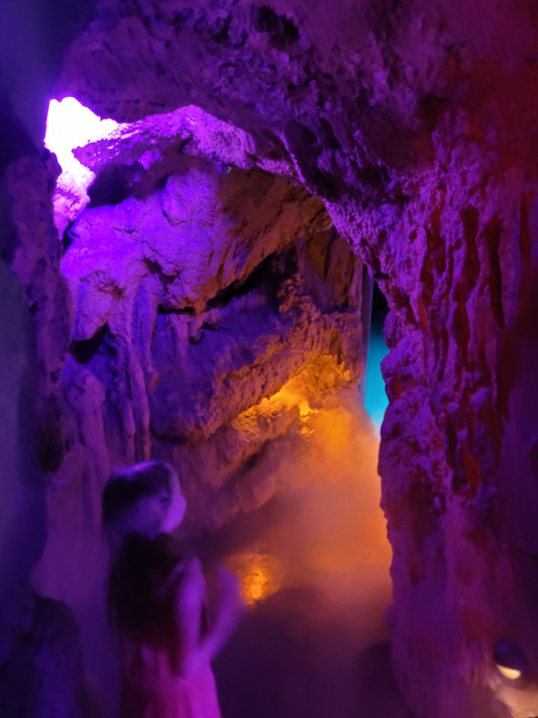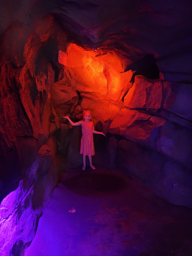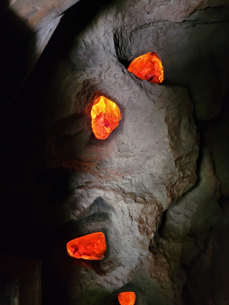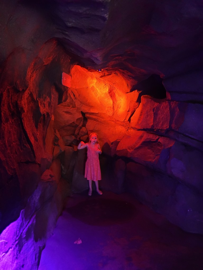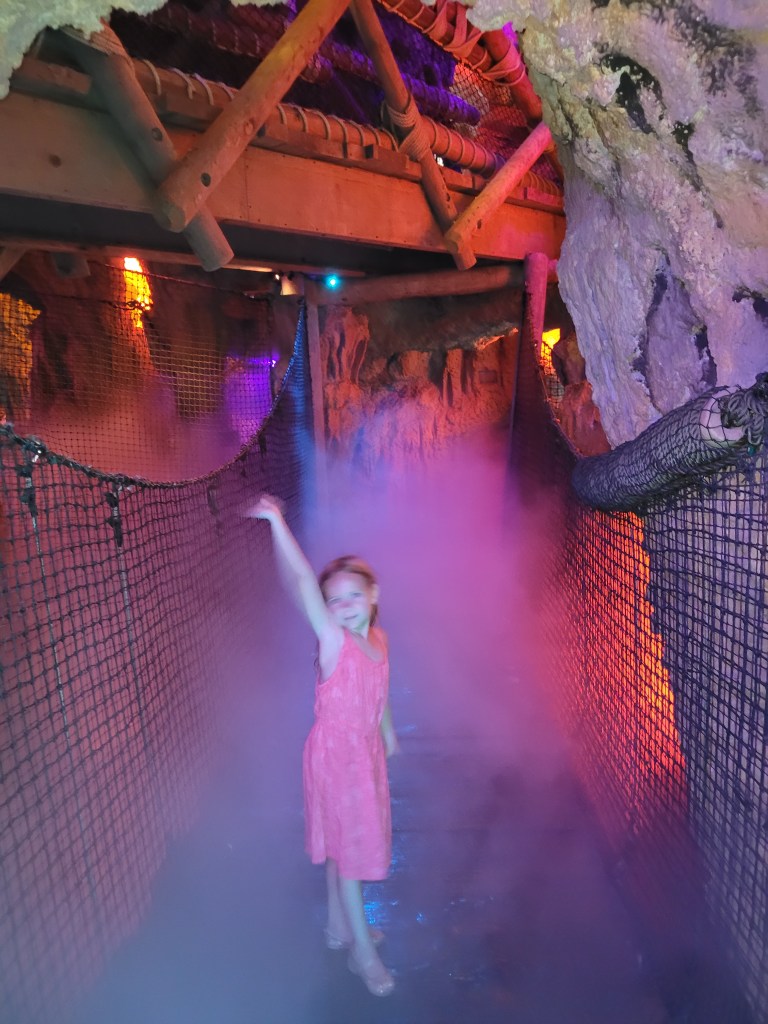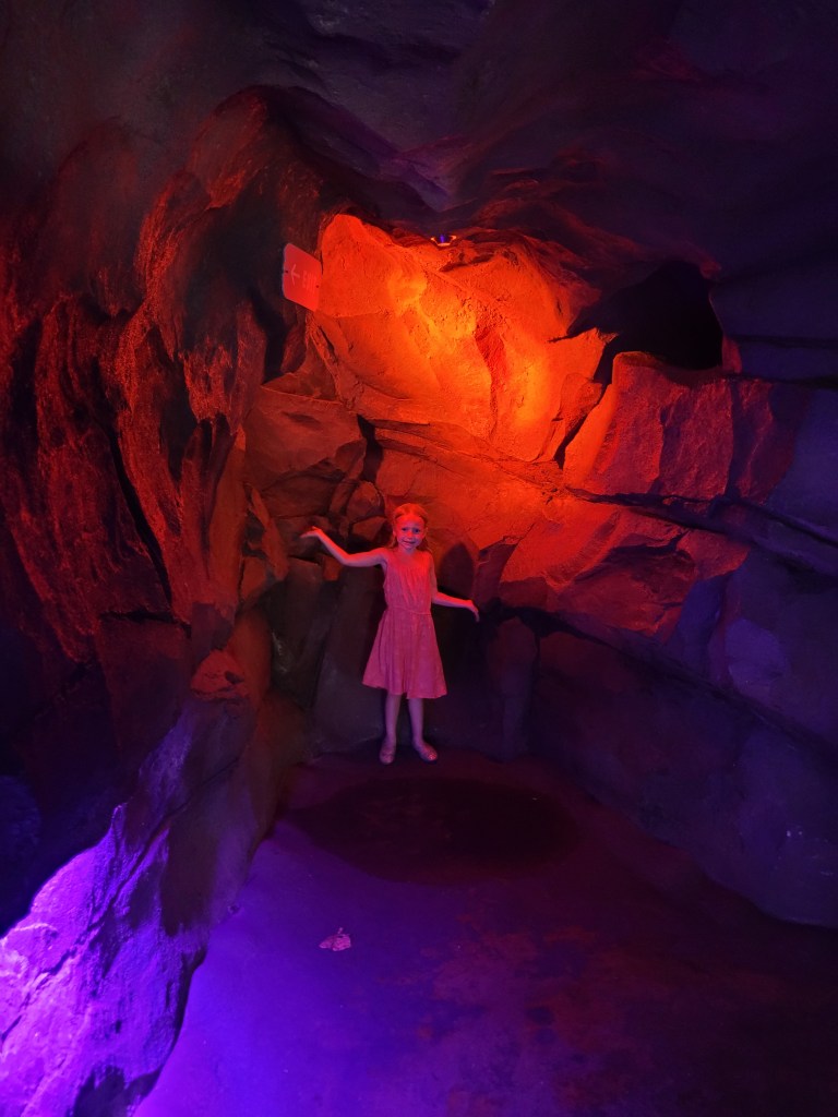 Next up was Jurassic Park (my personal favorite that is tied with Harry Potter 😃) where we went on Jurassic Park River Adventure. Maddie has been on this before, and she seemed to enjoy it in the past, but on this day… she did not enjoy it… at all 😓😤 she stated she never wanted to ride it again as we got off 🤷♀️( sad day for me if I want to ride it again while I’m with her). We then headed to Camp Jurassic where we finally experienced the amber caves!!!