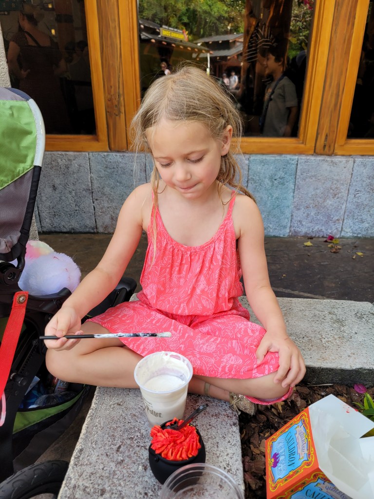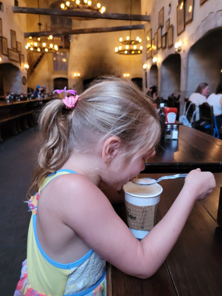 Butterbeer and cauldron cake 😃 (being eaten in Jurassic Park: that’s where we found a spot to sit 😬).