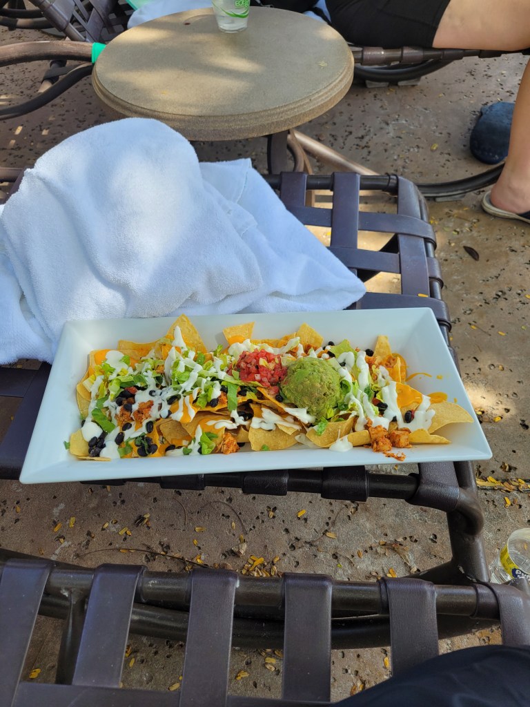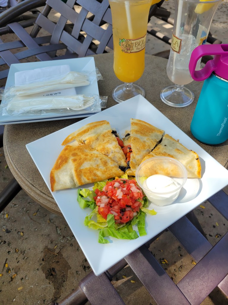 The parks closed early this particular night, so we decided to check out the pool area. We spent the afternoon and early evening at the pool. I ordered these snacks, but Maddie was more interested in swimming, so we didn’t eat much of them 🤷♀️ it was a quesadilla and nachos.