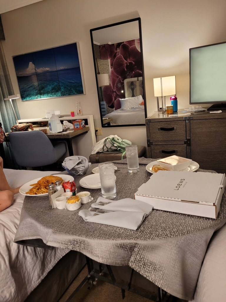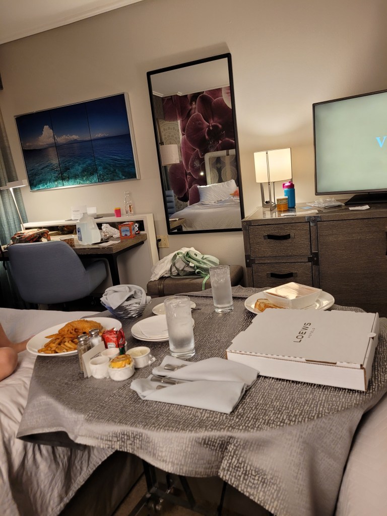 When the sun started to set, we headed back to the room where I ordered us room service for dinner!!! It was such a nice experience!!! The food was very good too! We had fish n chips, cheese pizza and tomato soup with grilled cheese 😋. We were going to try to roast marshmallows, but this property doesn’t have a fire pit! We did find a couple of cupcakes for dessert and the cookies and cream cupcake was AMAZING!!! I will absolutely seek that out again the next time we are at Universal!