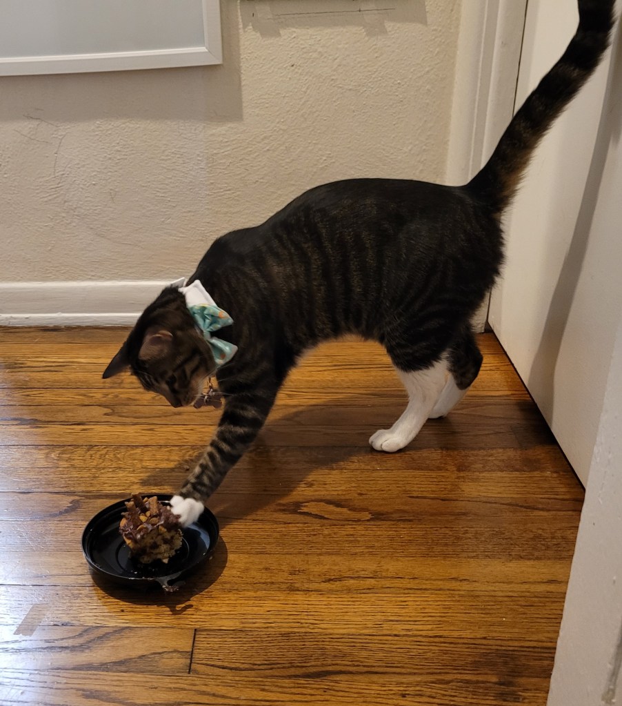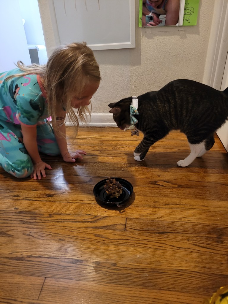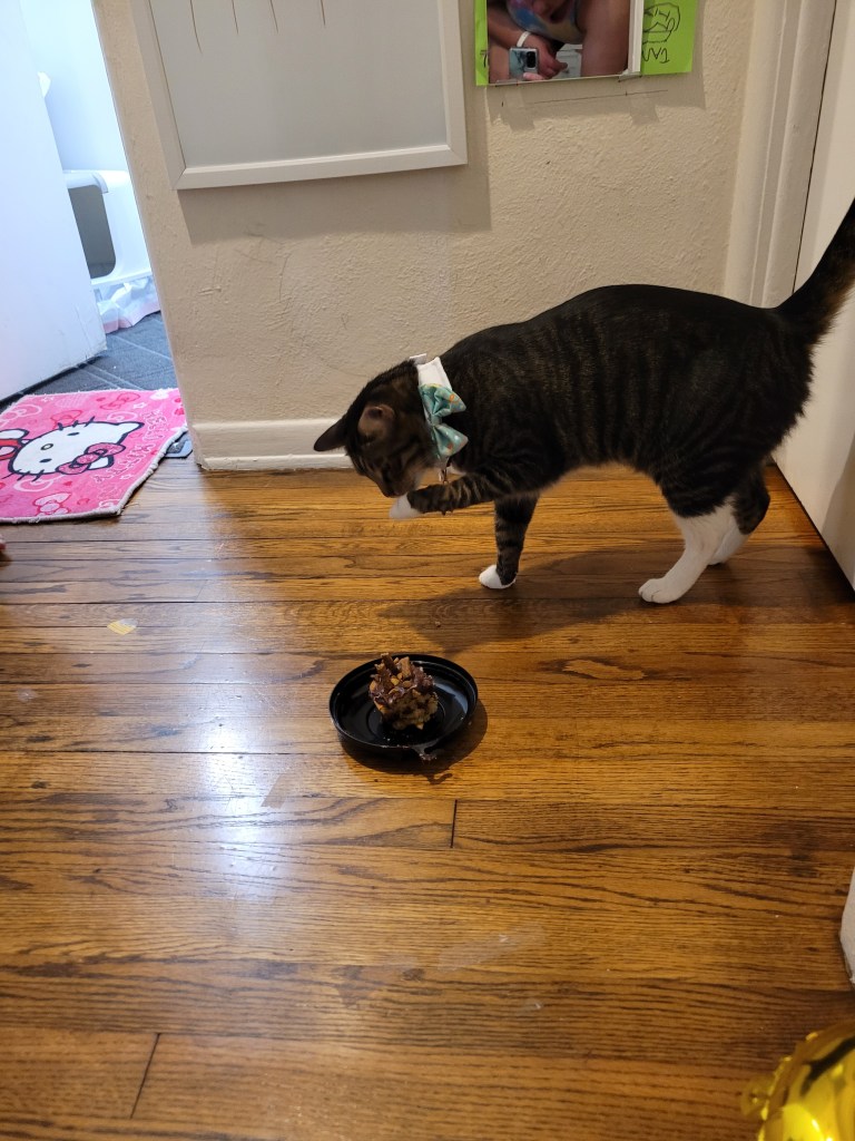 Kevin was not a fan of the cake (and I’m sure most sane people reading this will think “duh” however, this cat is continually stealing food from us that I NEVER thought cats ate ๐ณ and he eats a lot of it, or mushes it all over one of the 3 small rugs in the apartment ๐ฌ) even though Maddie put treats on top ๐ค. So that was interesting… seems like Ole Kevirs only wants human food when it’s off limits to him! Not sure if this is normal cat behavior because I grew up with dogs ๐ ๐คฃ.