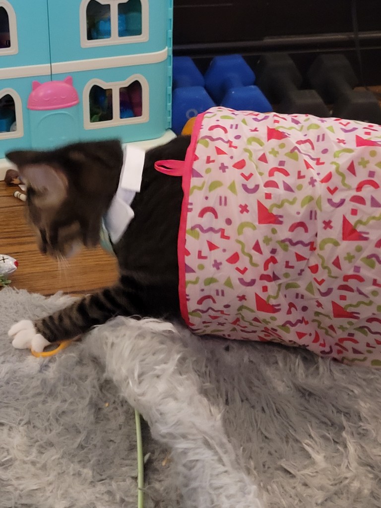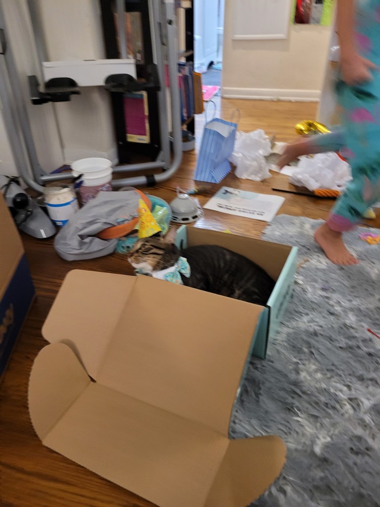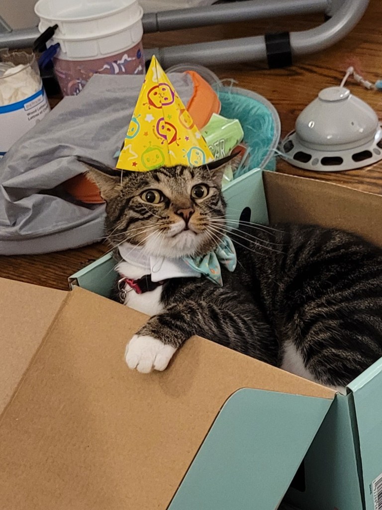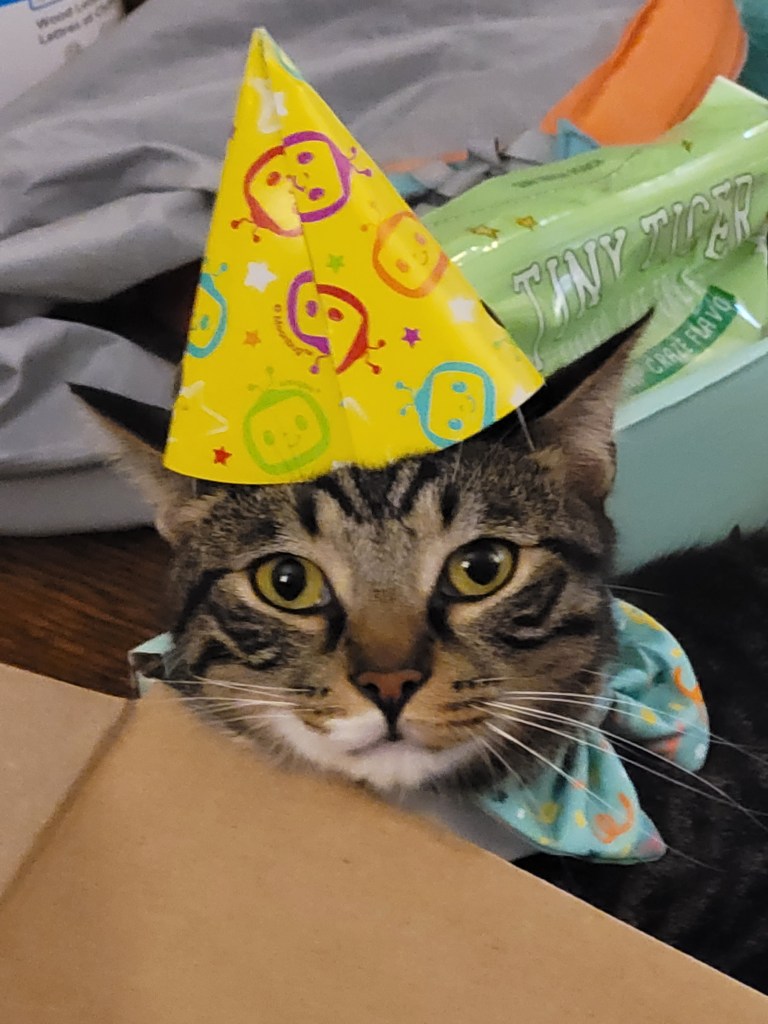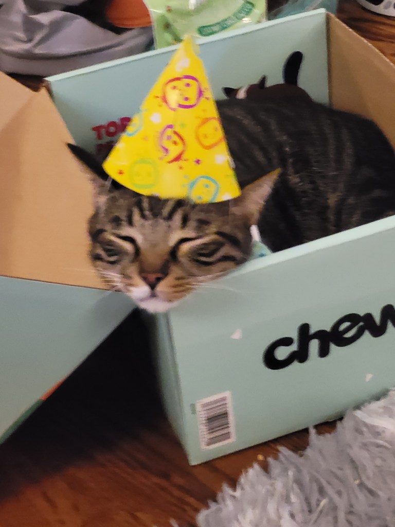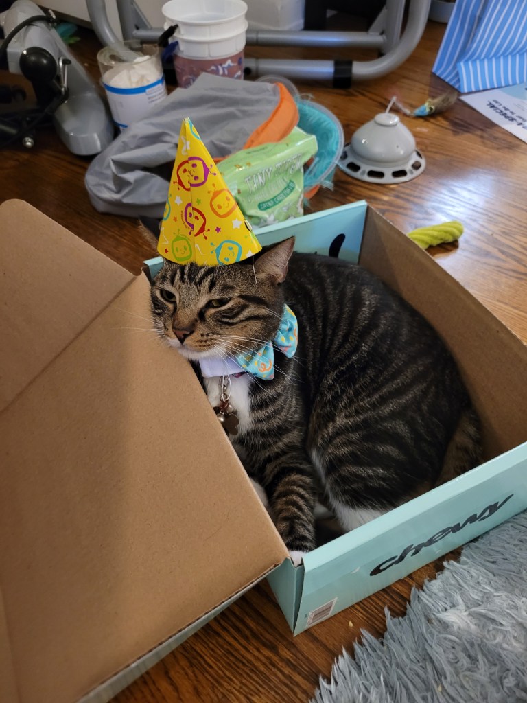 Miss Maddie insisted we give Kevin a birthday party for his second birthday (which was yesterday: August 26th). She has been asking when his birthday is since we got him, and last year I thought it was in early September- but then I looked it up and it’s Aug 26th ๐ฌ. By the time I realized last year, the date passed ๐คช so this year I had it on my calendar. I was also working my 3rd shift in a row, so when she asked earlier in the week to do something, I wasn’t too keen on the idea. However, I thought about it for a few days and decided even though I’m annoyed by him, she loves him and really wanted him to have a little party and a nice day. So I took her to target last night to let her get a few presents for him, a cake mix to bake a cake, and a few small party favors (like the hats in the pics ๐คฃ). My mom also knows how much she loves to give presents, so she ordered her a birthday box from Chewy so she would have stuff to give Ole Kevirs โค๏ธ.