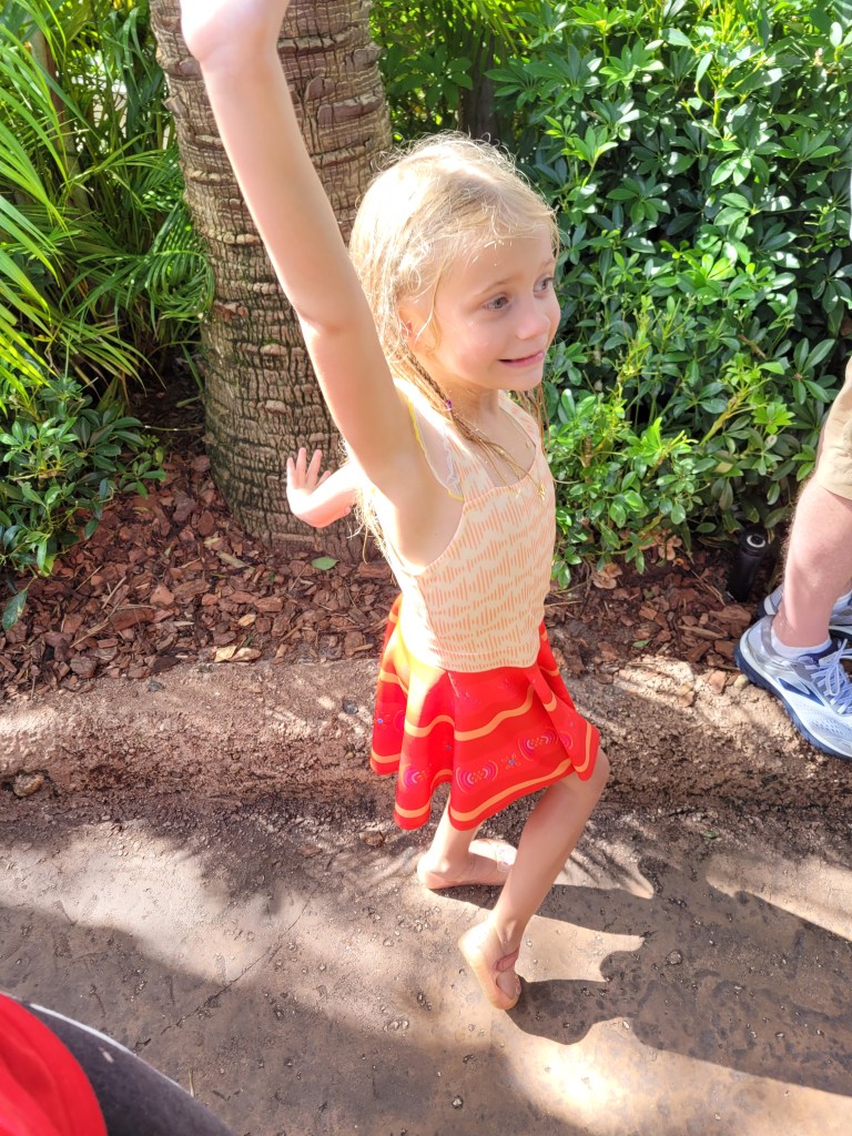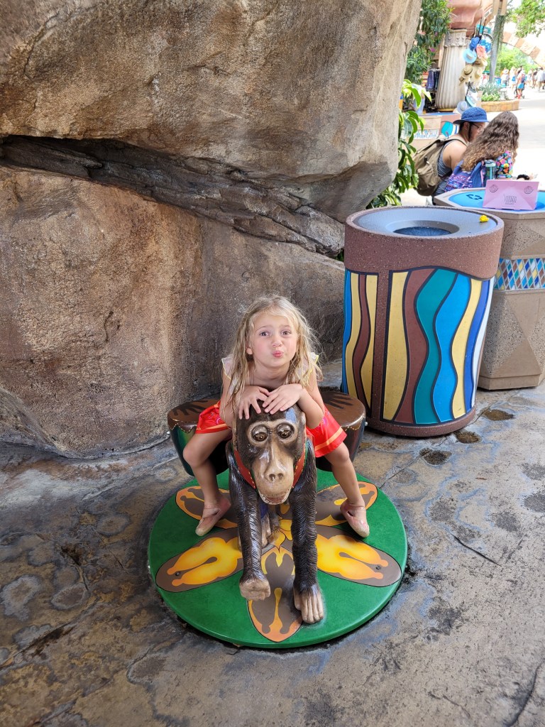 Our room wasn’t ready by the time we got back to Cabana Bay, so we decided to go to Volcano Bay. We spent a lot of the time in the wave pool… Maddie loved how the waves in that wave pool were different from the waves in Typhoon Lagoons wave pool. We also went in the lazy river and the kid’s area.