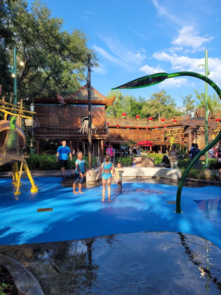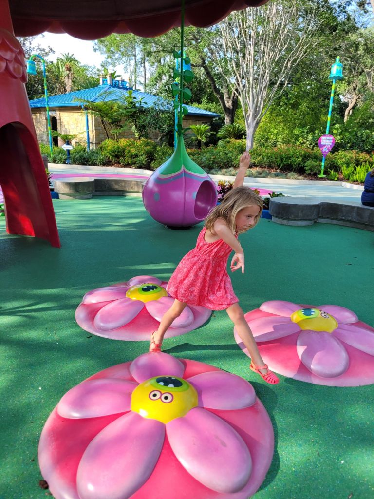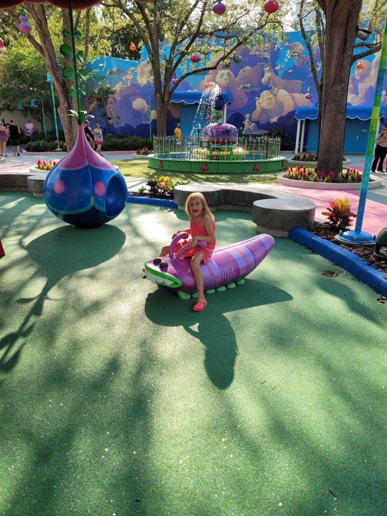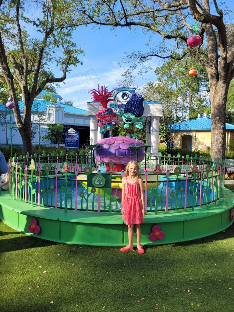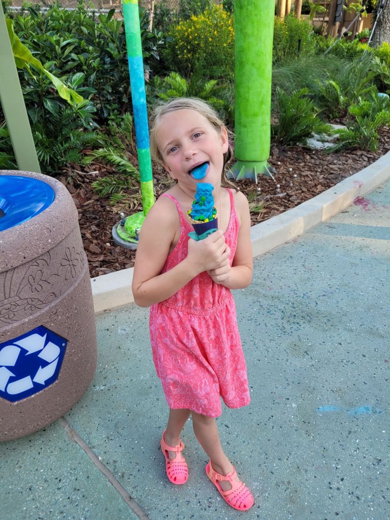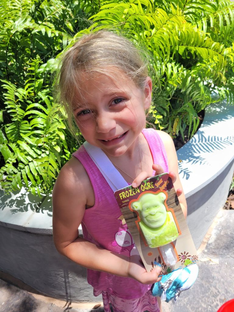 I was able to get us a passholder preview of this land on Memorial Day… we got to check it out in the evening of Memorial Day before it opened to the public. We tried a few new snacks, rode the Trollercoaster, and explored the area. We went back 2 days later while it was in technical rehearsals and got to watch the new show and eat the Shrek ice pop… both were amazing! On the last day of our trip, we went back in the evening and tried the Donkey ice pop, and Maddie got the pink lemonade soft serve from the trolls ice cream kiosk.